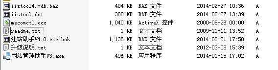 二、然后删除update.exe  iistool.dat 文件,改名“建站助手V4.0.exe”为“建站助手V4.0.exe.bak”;“iistool4.mdb”改名为“iistool4.mdb.bak”;“iistool.old”改名为“iistool.dat”,直接运行网站管理助手V3.exe即可使用,请注意如已在4版本新建立过站点、数据库、ftp等信息无法导入管理!