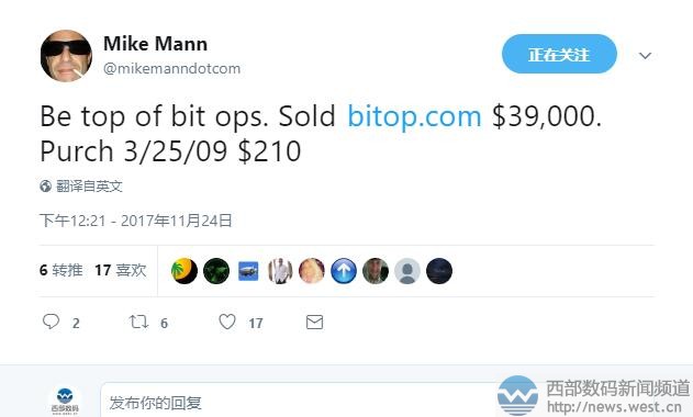 比特币的风大佬也要跟!Mike Mann超25万元出售域名bitop.com三五互联(35.com)11月27日消息,比特币的这把火已经持续烧了很长时间了,光是今年以来,相关域名就跟着水涨船高,不少投资人因此获利颇丰。当然域名圈最会销售域名的人也不例外,上周五Mike Mann就以39000美元出售了域名bitop.com,约合人民币25.7万元。