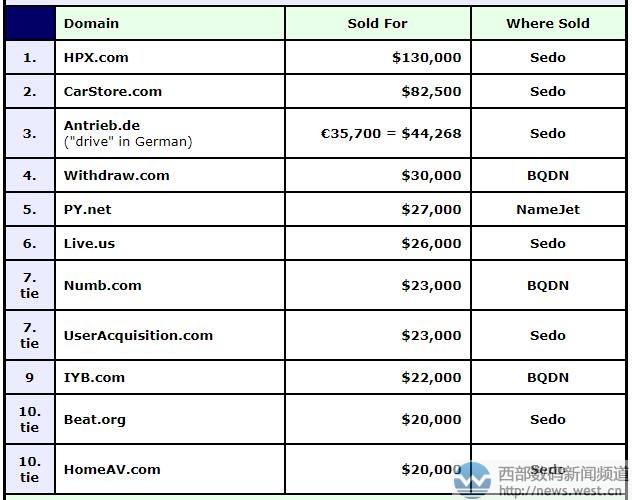 DN榜:三字母域名HPX.COM夺冠! “汽车商店”中六位成交2月8日消息,上周由于全球域名大会NamesCon在拉斯维加斯召开,DN榜未公布交易情况。本期的DN榜涵盖了1月22日–2月4日期间成交价最高的域名,其中三声母域名HPX.COM以130,000美元排在第一,约合人民币81万元。
