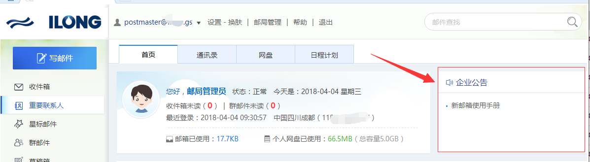 2、在邮局管理中,继续点击“邮局管理”--“企业公告”--“新建公告”。