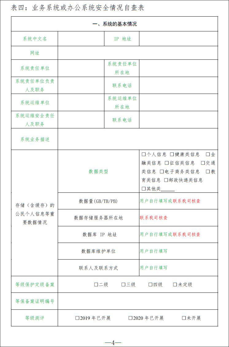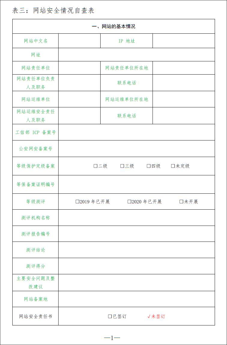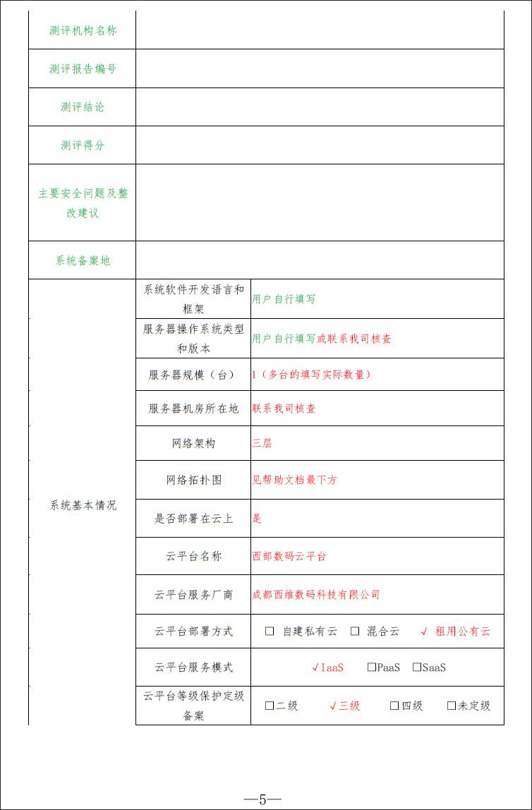 2020 年公安机关网络安全监督检查自查表-填表说明此填表说明适用于《2020 年公安机关网络安全监督检查自查表》纸质版和《2020 年公安机关网络安全监督检查自查采集工具》的填写。 >>>填表说明: 1、如果您的单位不是行业主管部门或者网络运营者,不用填写“表一:行业主管部门填写”和“表二:网络运营者填写”,直接选择表三或表四填写。 2、如果您使用的是虚拟主机请升级为云主机,然后填写。虚拟主机不适用于本表填写。 3、图中绿色的部分,需要用户自行填写,红色的部分请参照页面文字填写,需联系我司核实的信息请添加我司在线客服QQ 800019263 联系售后咨询或提交工单咨询。 网络拓扑图: 网站安全承诺书下载: