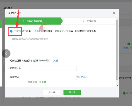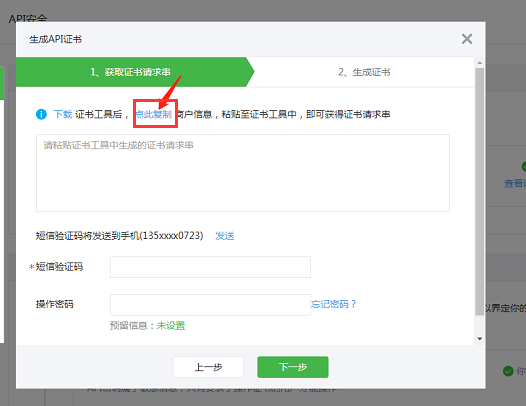 6、在证书工具里复制的证书串点后返回【微信支付商户平台】,将复制的证书请求串粘贴至生成aid证书的页面,并输入短信验证码及操作密码,点击下一步