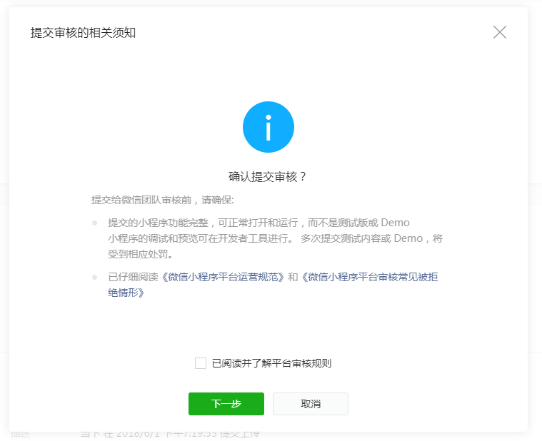 三、注意事项1.在线上传与代码包下载两种小程序发布方式,同一时间只能使用其中一种。如果小程序已经发布,随意切换小程序发布方式会导致已发布的小程序无法正常访问,必须重新提交审核通过后才能恢复访问。2.代码包下载的方式,将无法在本平台对小程序进行预览、提交审核以及发布小程序3.小程序提交审核前,请认真阅读《微信小程序平台运营规范》和《微信小程序平台常见拒绝情形》并仔细检查小程序内容,提高小程序审核通过的概率。