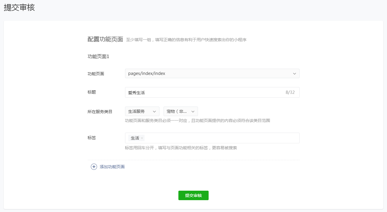 1.4提交审核/发布提交审核:每点击【一键打包】打包小程序,在“微信审核”页面会将会生成一条打包记录,点击【提交审核】将代码包提交到微信进行审核,微信审核周期一般为7个工作日,在提交审核前请先认真阅读《微信小程序平台运营规范》和《微信小程序平台常见拒绝情形》; 审核通过:微信审核通过后,点击【发布】按钮,稍等片刻,即可在手机微信小程序搜索中查到已发布的小程序,完成发布流程; 审核失败:如微信审核失败请注意可看失败提示,及时登录微信小程序后台处理相关问题; 注意:同一时间只允许提交审核1个小程序。