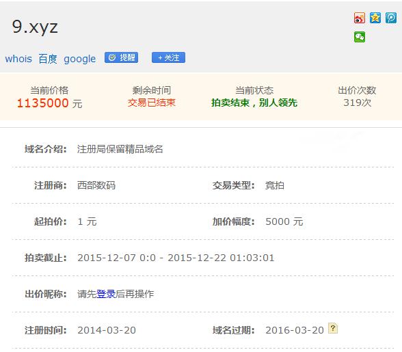 9.xyz域名113.5万高价结拍,单数字行情持续升温三五互联12月22日讯,昨天,极品稀缺单数字域名9.xyz在三五互联以113.5万高价结拍。